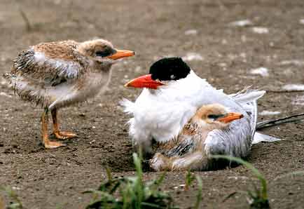 TERN-ED AWAY: The world's largest colony of Caspian terns used to breed on Rice Island in Oregon's Columbia River. But when the terns' appetite for salmon got them in trouble, scientists used decoys and other methods to attract the colony to a new breeding site: East Sand Island, where both adults and chicks (above) are now thriving.